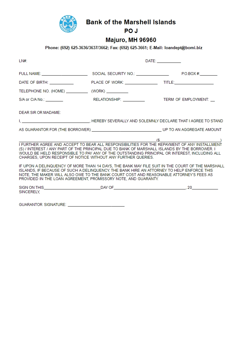 The standard guarantor form required for most loan applications at the Bank of the Marshall Islands.